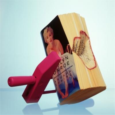 Folded book with leather cover; the artefact stands on a black lacquered base with a red lacquered bead. |