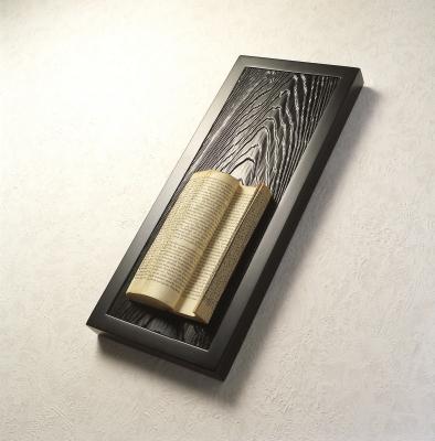 In this fine piece of art the folded book corresponds beautifully with the lively grained wooden panel it is mounted upon. The book suggests as if someone just dropped his reading; the folded pages are still open and are reflecting the waves of the lacquered wood. |