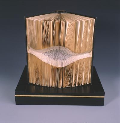 Buch gefaltet; matt schwarz lackierter Holzsockel mit Echtgoldeinlage. |