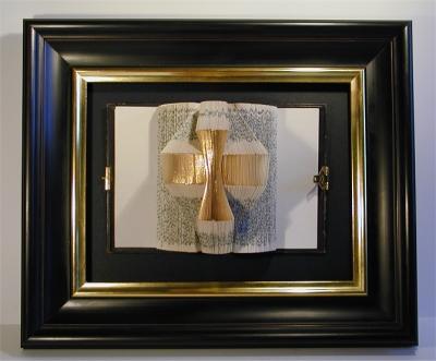 Ein schwarzer Rahmen mit goldener Innenkante umschließt das schwarze Passepartout, worauf das alte Gesangbuch montiert wurde. Die mittleren Seiten des Buches wurden zu einem Längs- und zwei Querstegen gefaltet und ergeben als Ganzes die Form eines Kreuzes. In einer Zeit, in der sich kaum noch jemand traut, ein Kreuz aufzuhängen, gibt gerade dieses Kunstobjekt dem Betrachter die Möglichkeit, sich mit der Kirche und dem christlichen Glaube auf stille und sehr persönliche Weise auseinander zu setzen. |