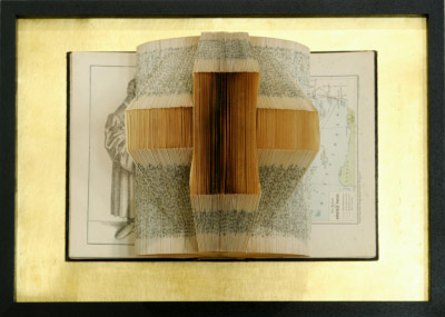 Buch gefaltet; schwarzer Einband mit goldenem Passepartout (echtes Blattgold); Rahmen des Objektes schwarz lackiertes Holz |