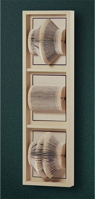 Technik: Bücher gefaltet und montiert auf einem speziell angefertigten Holzrahmen mit tiefer eingelegter Holzplatte - weiß lackiert.