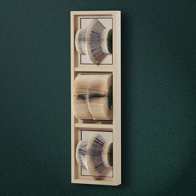 Bücher gefaltet und montiert auf einem speziell angefertigten Holzrahmen mit tiefer eingelegter Holzplatte - weiß lackiert. |